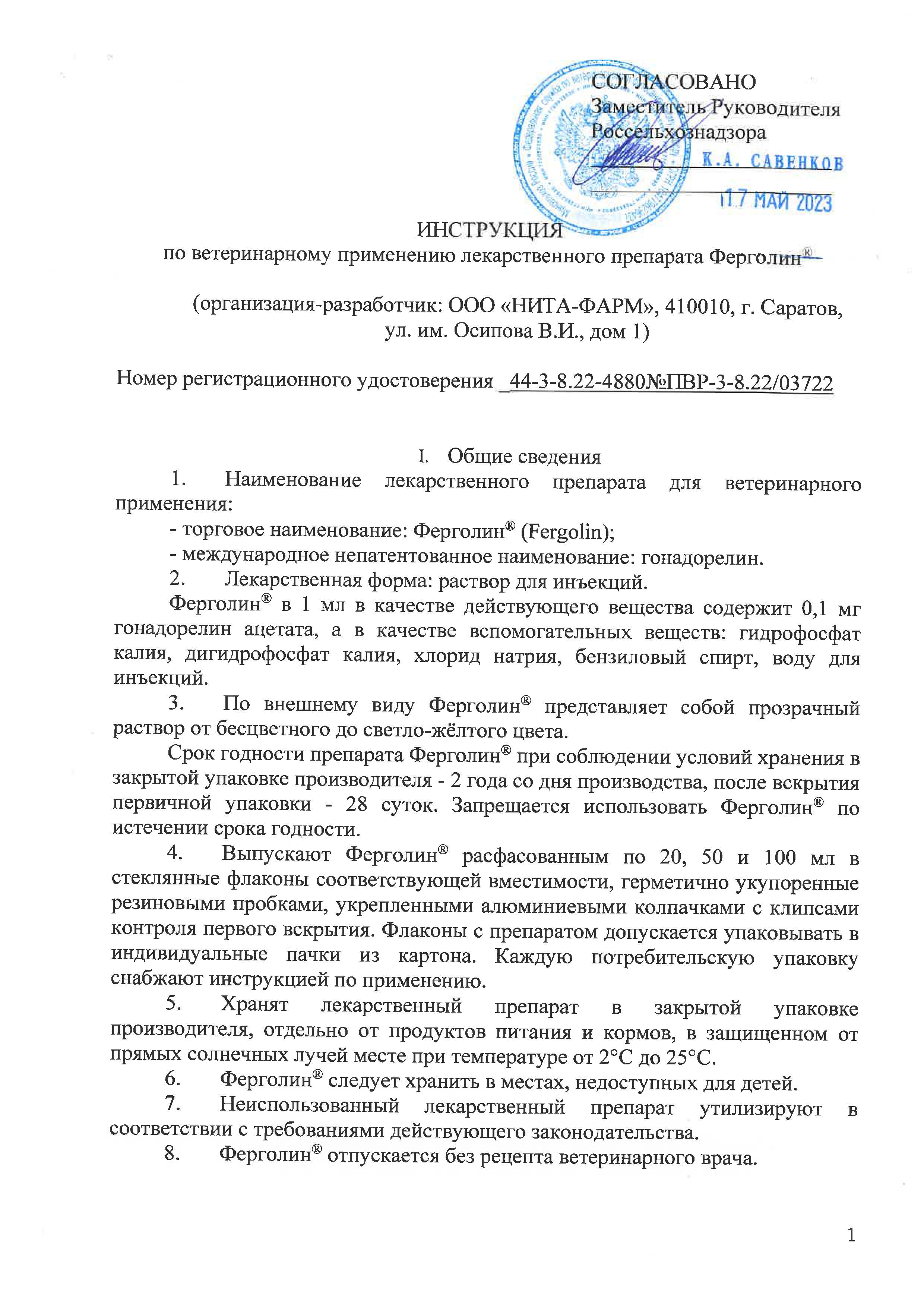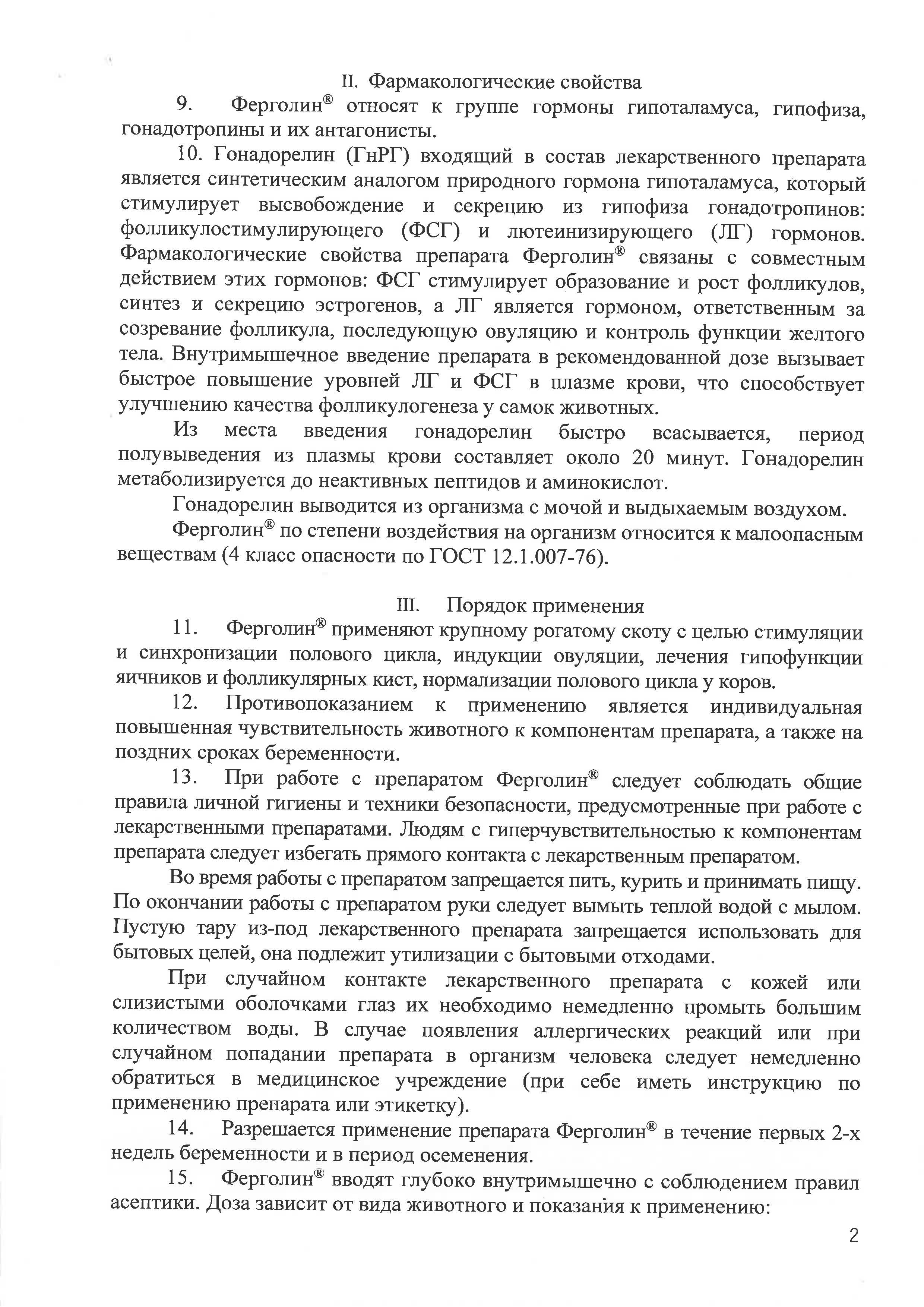 Ферголин применяют крупному рогатому скоту с целью стимуляции половой охоты, синхронизации полового цикла, индукции овуляции, лечения гипофункции яичников и фолликулярных кист, нормализации полового цикла у коров.