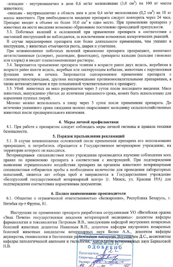 Противопоказания к применению: нарушение функции почек и печени, повышенная чувствительность к препарату. Запрещается одновременное применение препарата с глюкокортикостероидами, другими нестероидными противовоспалительными препаратами, а также антикоагулянтами. Запрещается применять телятам в возрасте ранее 2 недель, жеребятам - ранее 6 недель, жеребым или лактирующим кобылам