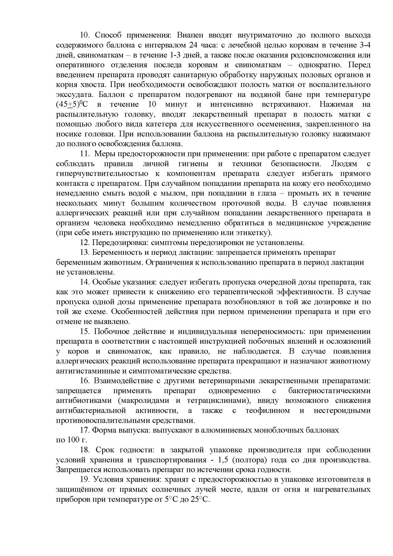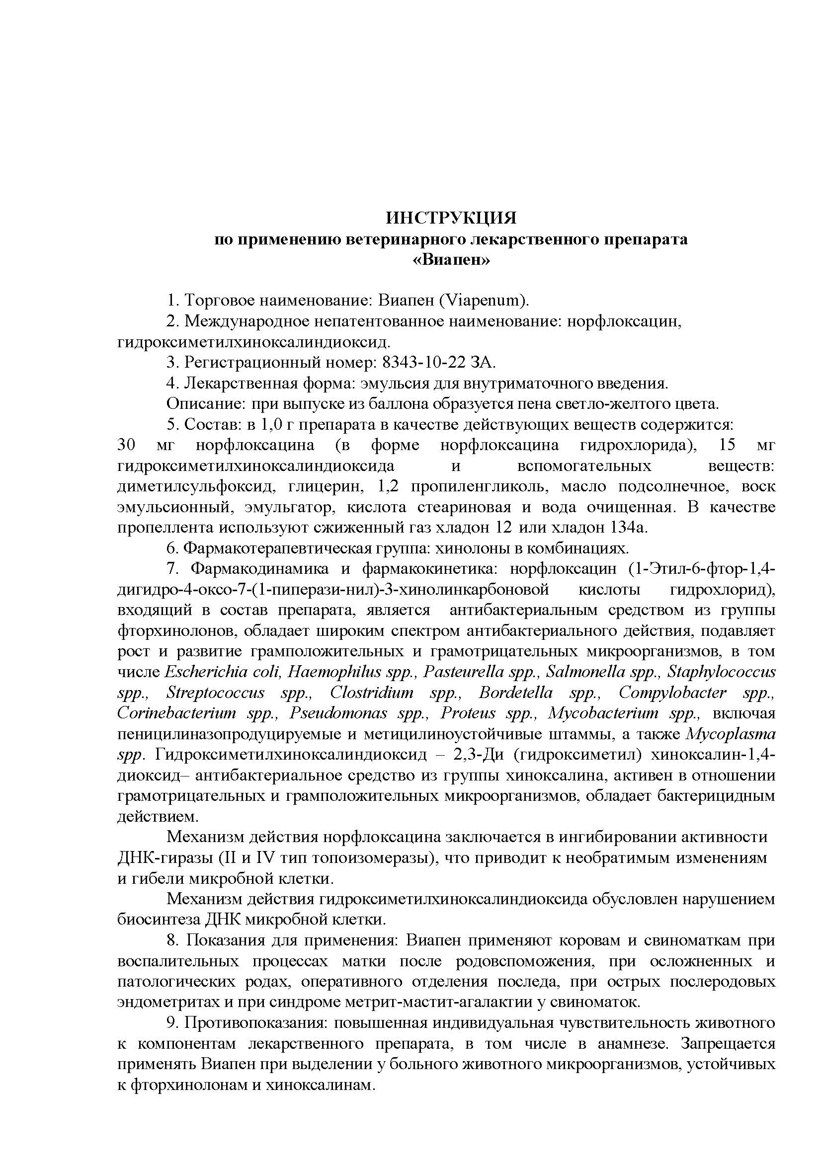 Виапен применяют коровам и свиноматкам при воспалительных процессах матки после родовспоможения, при осложненных и патологических родах, оперативного отделения последа, при острых послеродовых эндометритах и при синдроме метрит-мастит-агалактии у свиноматок.