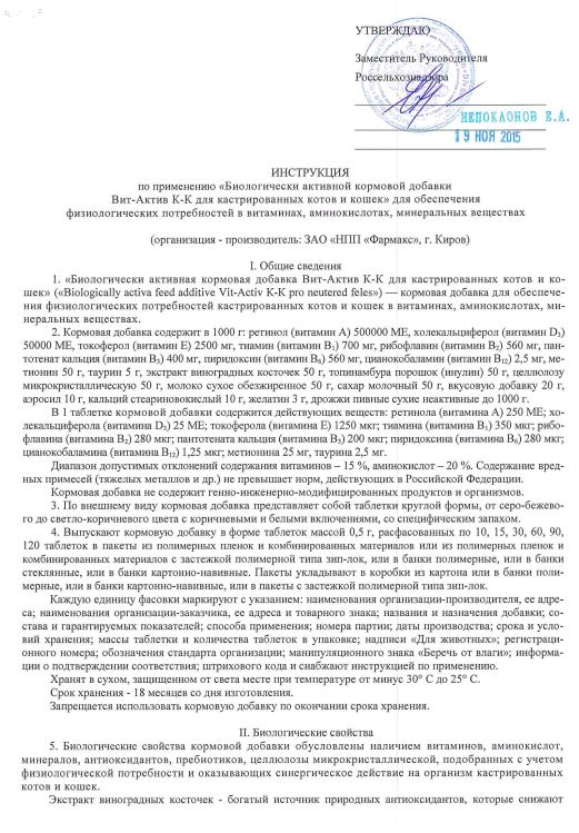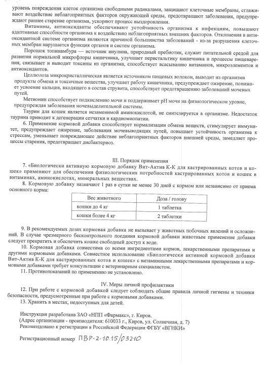 Вит-Актив - витаминно-минеральный комплекс для предупреждения заболеваний мочевыводящих путей, обеспечения физиологических потребностей кастрированных котов и кошек в витаминах и аминокислотах, обогащения рациона природными антиоксидантами и пребиотиками.